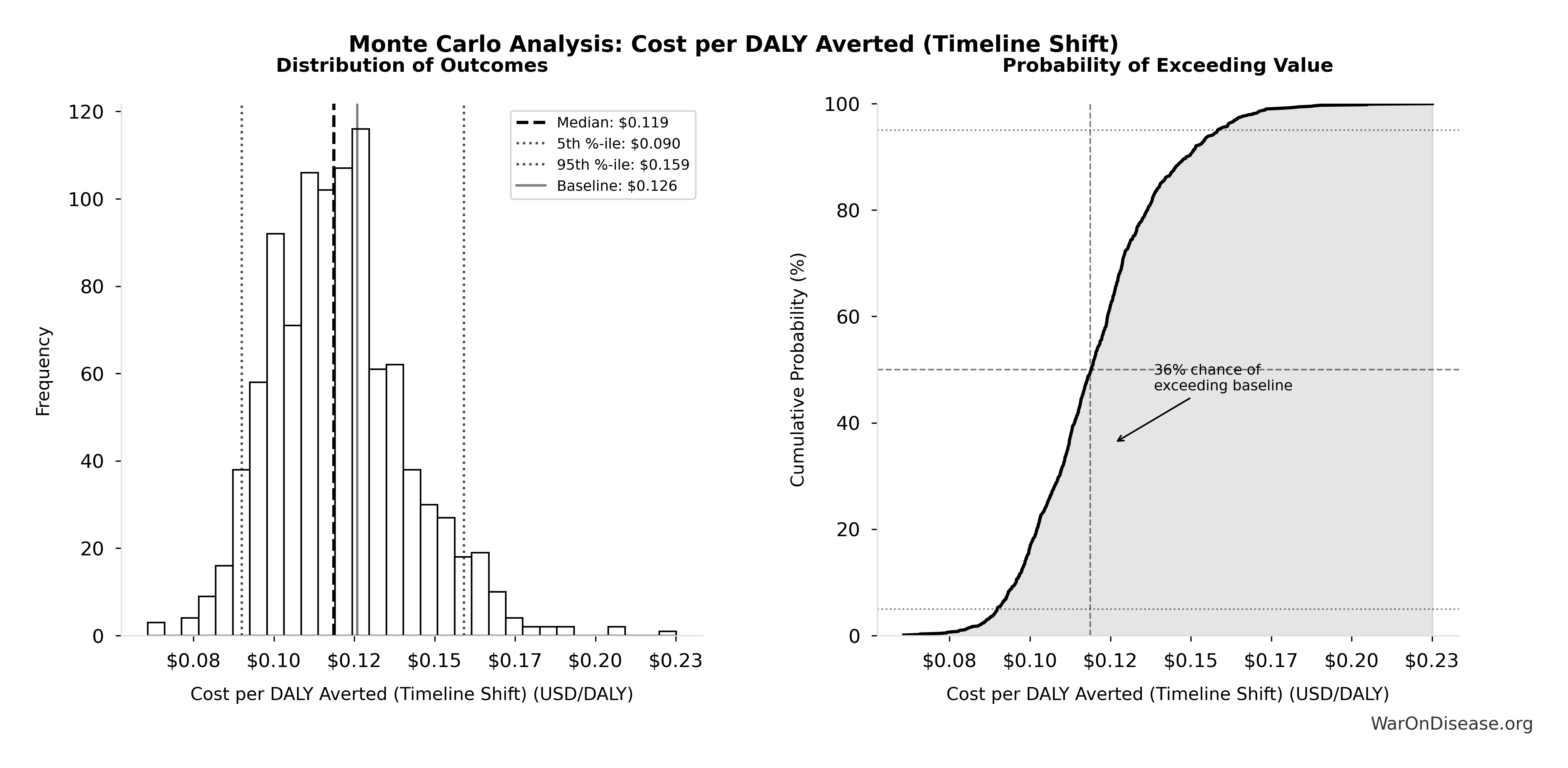 Robustness: Even at 1% probability of adoption, risk-adjusted cost-effectiveness ($13/DALY) remains 7.07× better than bed nets. Monte Carlo simulation across 10,000 trials confirms the intervention maintains cost-dominance under all plausible parameter scenarios.