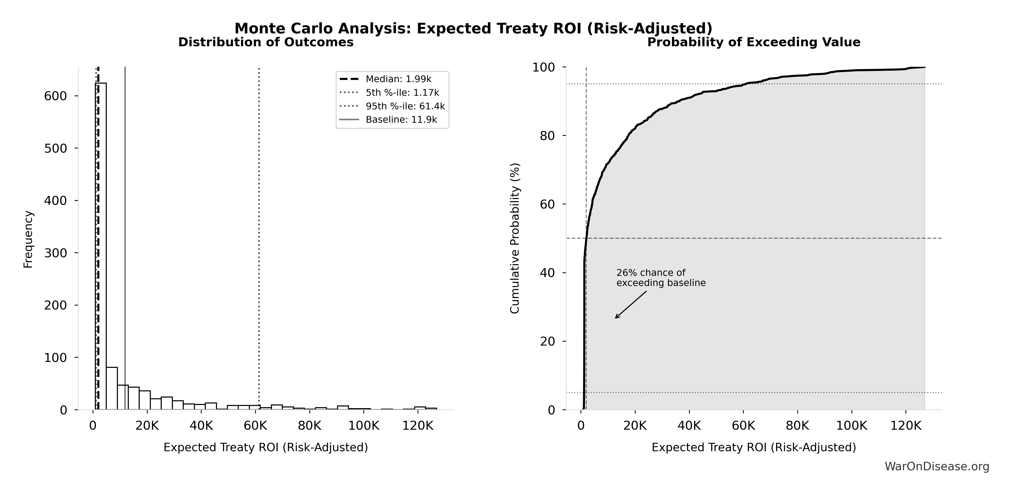 - Risk-adjusted (11.9k:1 expected ROI): Central estimate with political success probability uncertainty (5%-50% range), intervention generates substantial positive returns