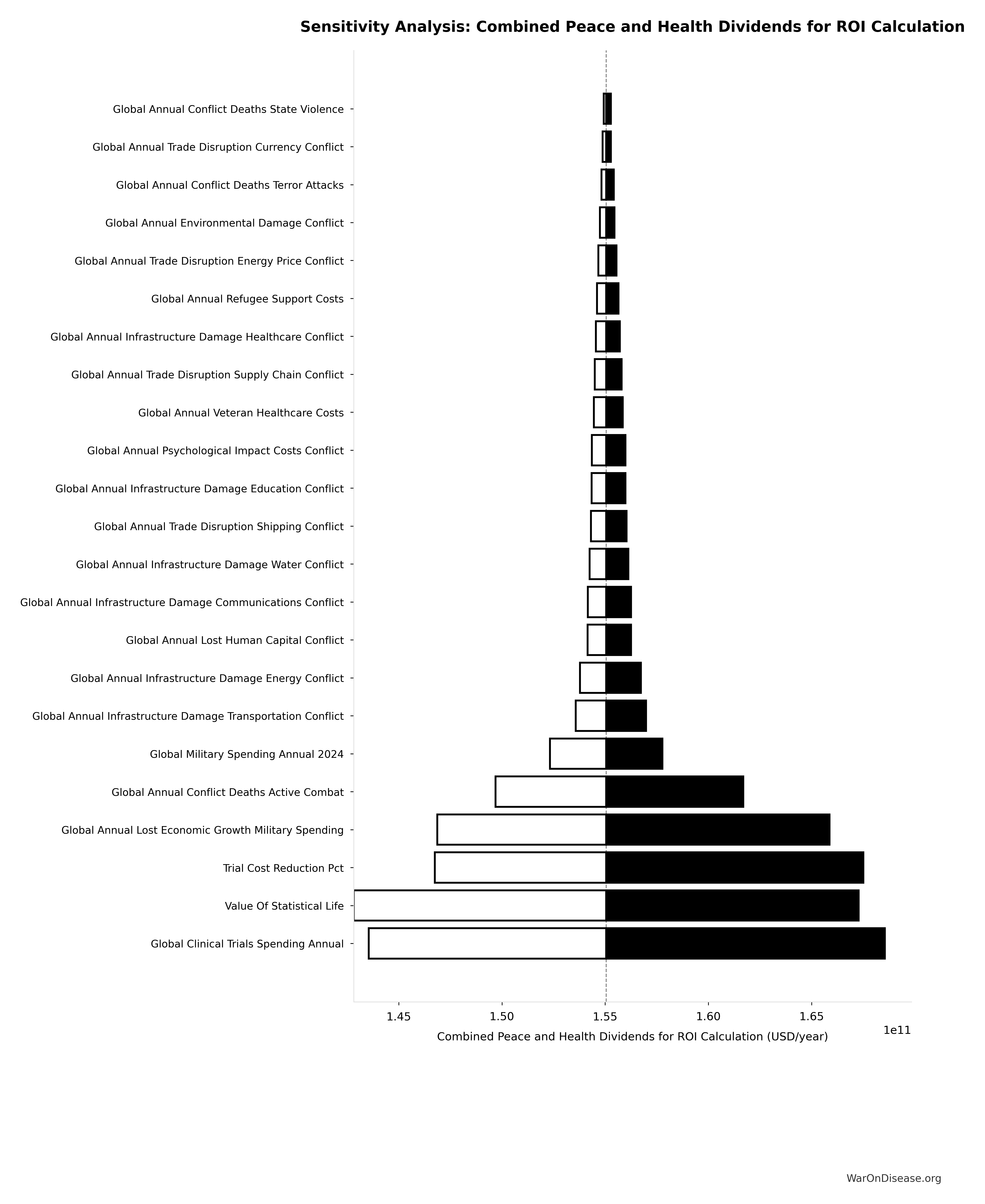 - Conservative (451:1 ROI): R&D savings only, excludes peace dividend, intervention is dominant