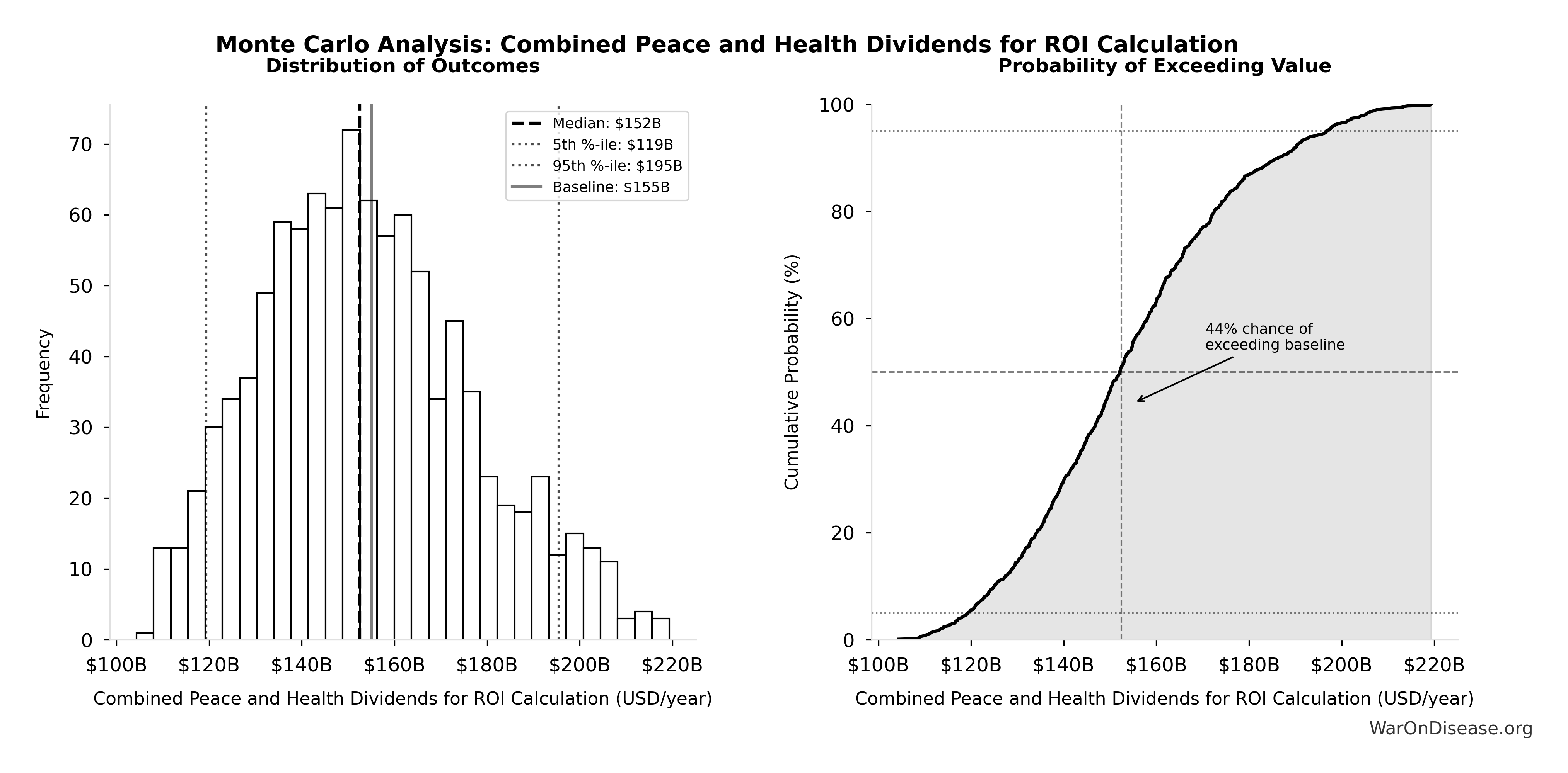 Methods: Cost-benefit analysis, NPV calculations, QALY modeling, and ICER analysis using SIPRI military expenditure data, WHO mortality statistics, Oxford RECOVERY trial results, and published clinical trial cost literature. Conservative estimates exclude research acceleration effects; complete estimates include all quantifiable benefits. All parameters, data sources, and uncertainty ranges documented in Parameters and Calculations.