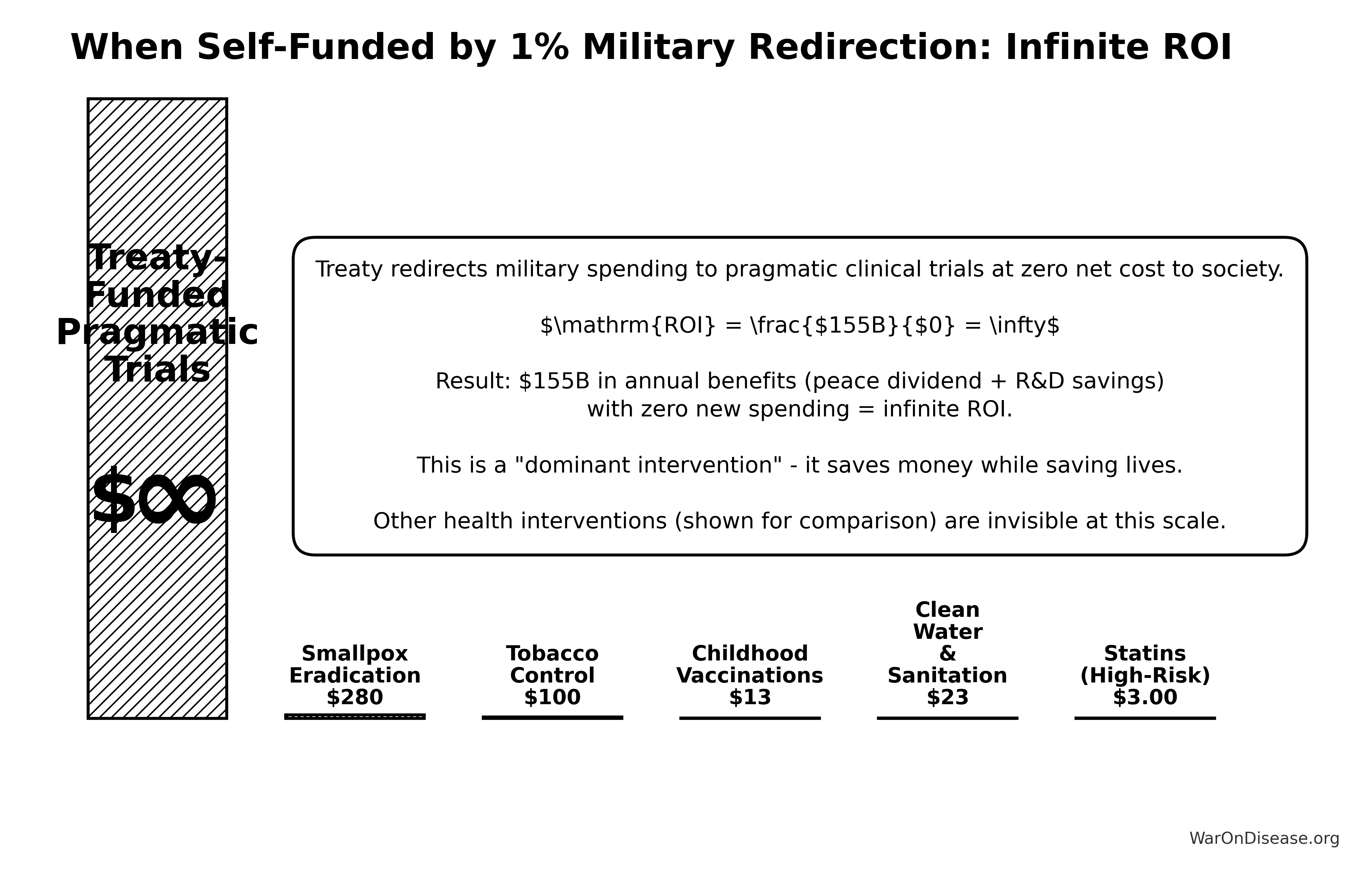 A 1% Treaty: Proposed international agreement where signatory nations commit to reducing military expenditure by 1% and redirecting those funds ($27.2B globally) to pragmatic clinical trials infrastructure.