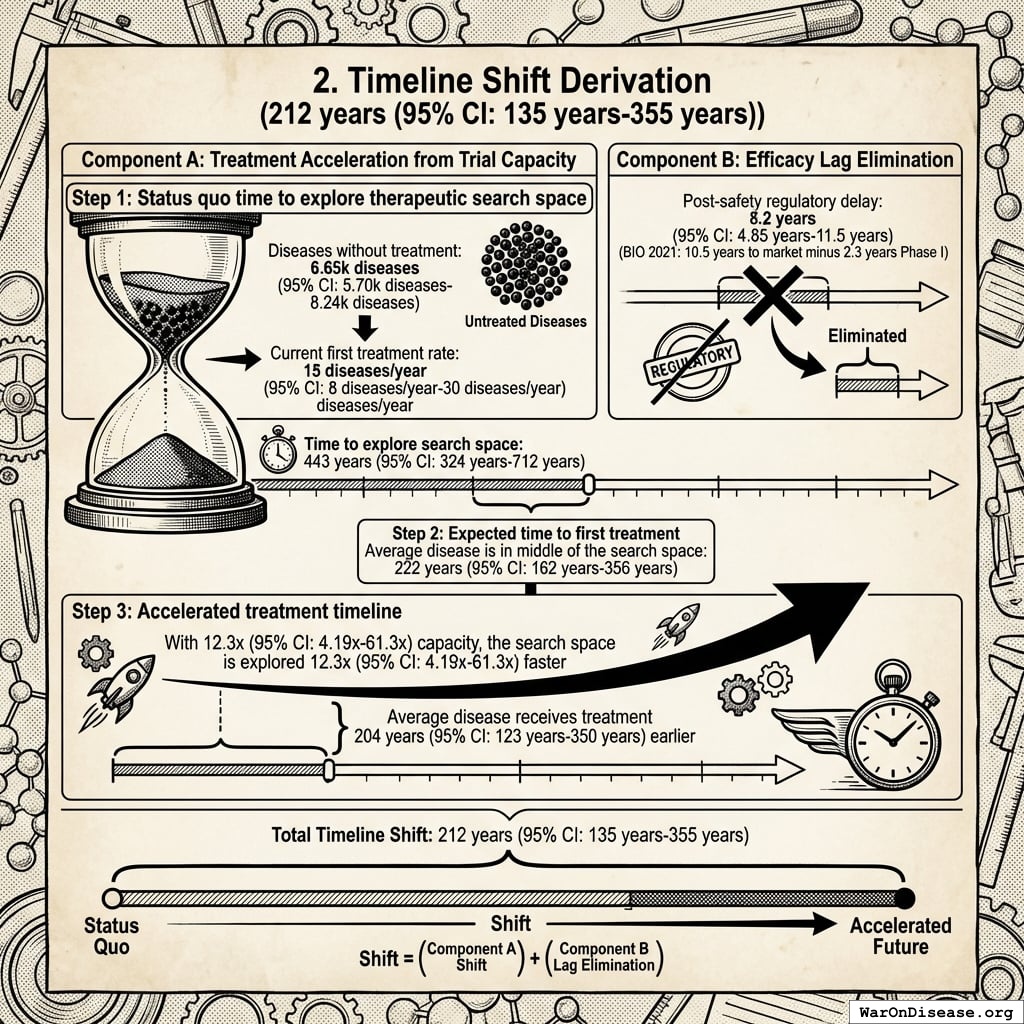 Interpreting the 212 years (95% CI: 135 years-355 years)-Year Timeline Figure: This is a discovery capacity model result, not “time travel” or a prediction that we will achieve results centuries from now. If we must test 9.50M combinations drug-disease combinations to find all effective treatments, the current system (15 diseases/year (95% CI: 8 diseases/year-30 diseases/year) treatments/year) would take ~443 years (95% CI: 324 years-712 years) to explore this therapeutic search space. Scaling capacity 12.3x (95% CI: 4.19x-61.3x) reduces exploration time to ~36 years (95% CI: 11.6 years-77.2 years). The “212 years (95% CI: 135 years-355 years)” represents the average time a treatment that could be discovered today would have waited under the old system versus the new system. Treatments discovered sooner save lives during the intervening period; this cumulative benefit over the acceleration period yields the headline mortality and economic figures.