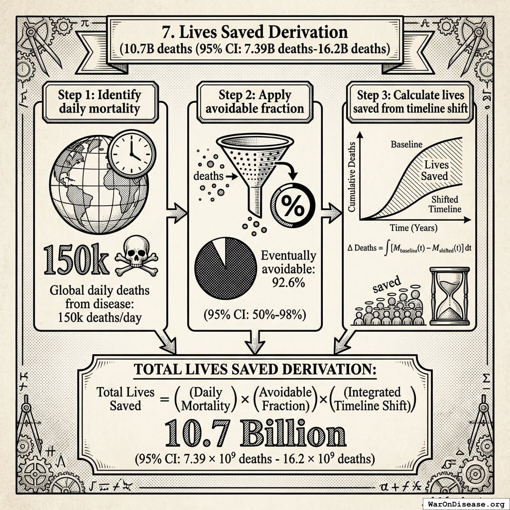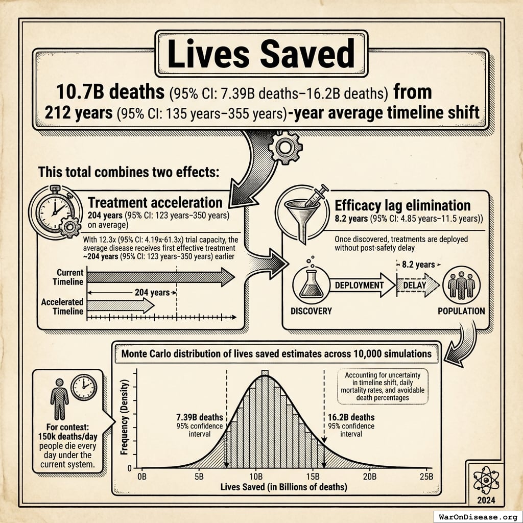 Redirect 1% of military spending ($27.2B/year) to pragmatic clinical trials. Trial capacity jumps 12.3x (95% CI: 4.19x-61.3x). Search space explored in ~36 years (95% CI: 11.6 years-77.2 years) instead of centuries. Average treatment reaches patients 212 years (95% CI: 135 years-355 years) sooner. Timeline shift saves 10.7B deaths (95% CI: 7.39B deaths-16.2B deaths), valued at $84.8 quadrillion (95% CI: $62.4 quadrillion-$97.3 quadrillion).