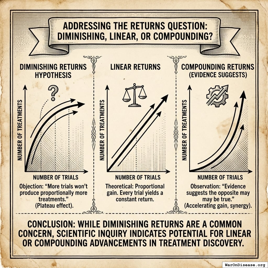 Quality versus quantity trade-off: 12.3x (95% CI: 4.19x-61.3x) more trials may not yield proportional breakthroughs if resources spread thin or trial quality declines. The analysis assumes quality maintenance through peer review and replication; actual quality effects remain uncertain.