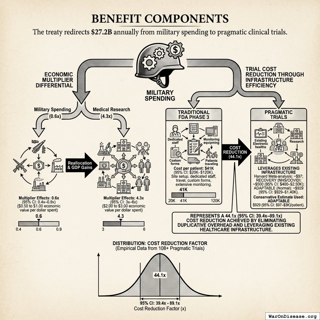Primary Hypothesis: Reallocating 1% of global military spending ($27.2B annually) to fund decentralized pragmatic clinical trials generates return on investment between 637:1 (95% CI: 569:1-790:1) (conservative estimate, R&D savings only) and 84.8M:1 (95% CI: 46.6M:1-144M:1) (complete estimate, including peace dividend and all direct benefits), representing a dominant health intervention that simultaneously reduces costs while improving health outcomes.