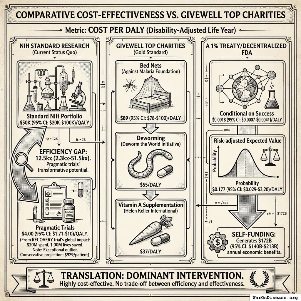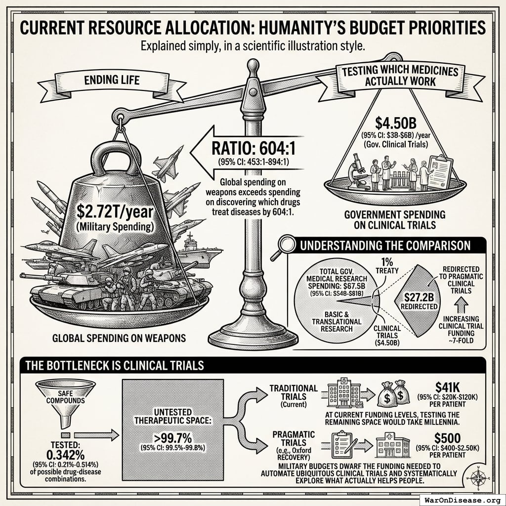 The solution: Redirecting 1% of global military spending ($27.2B/year) to pragmatic clinical trials increases capacity 12.3x (95% CI: 4.19x-61.3x) (to ~185 diseases/year (95% CI: 107 diseases/year-490 diseases/year) treatments/year). Pragmatic trials cost $929 (95% CI: $97-$3K)/patient versus $41K (95% CI: $20K-$120K)/patient for traditional trials, enabling vastly more parallel research. This reduces time to explore all therapeutic possibilities from ~443 years (95% CI: 324 years-712 years) to ~36 years (95% CI: 11.6 years-77.2 years).
