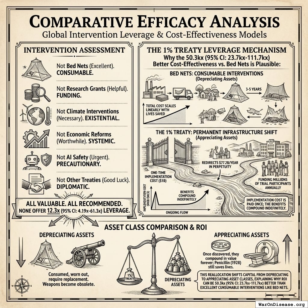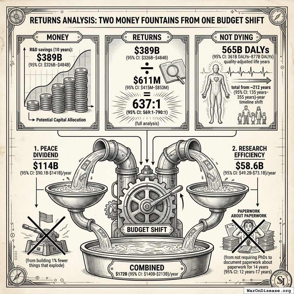 Implications: This intervention corrects a fundamental capital misallocation: military spending creates depreciating assets (weapons become obsolete), while medical research creates appreciating assets (treatments compound in value). Comparable to smallpox eradication (280:1 ROI), it represents the highest-ROI reallocation available to policymakers.