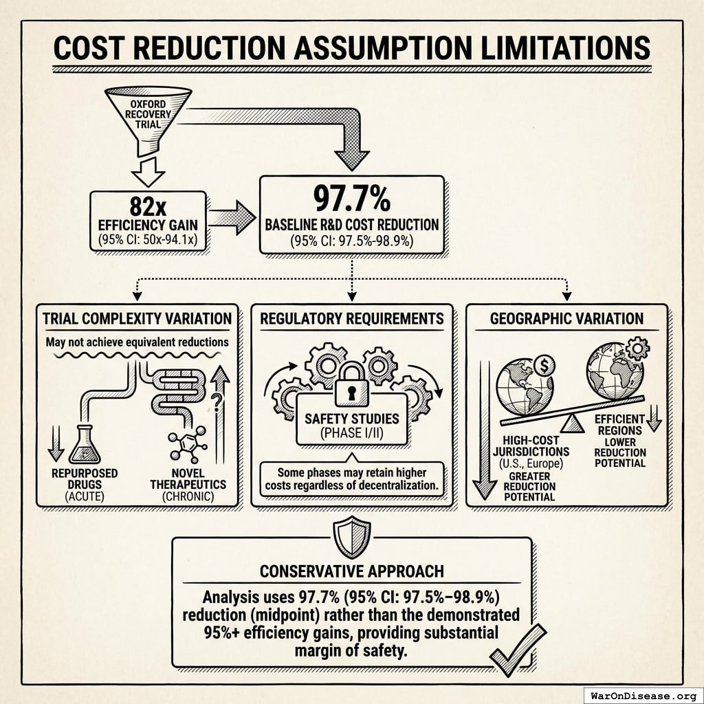 - Empirical grounding: Cost reductions based on meta-analysis of 108 pragmatic trials138 plus large-scale implementations (RECOVERY, ADAPTABLE), not theoretical models