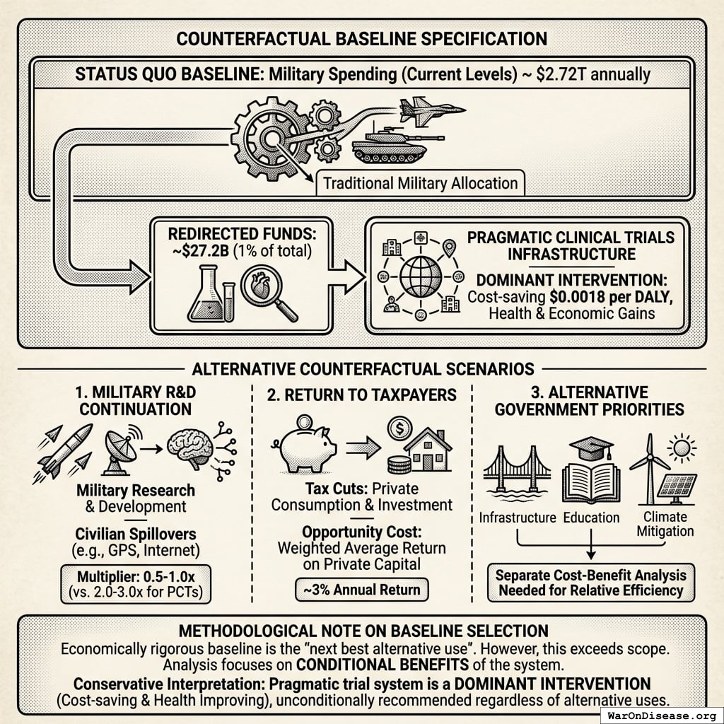 This analysis employs partial equilibrium methodology, holding prices and market structures constant while evaluating the intervention’s direct effects. General equilibrium analysis would account for market adjustments to the $27.2B annual reallocation from military to pragmatic clinical trials spending.