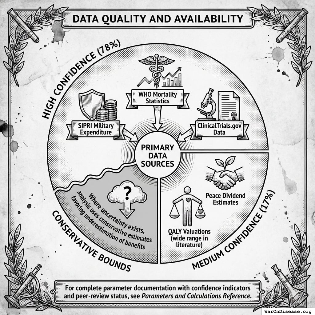 Methods: Cost-benefit analysis, NPV calculations, QALY modeling, and ICER analysis using SIPRI military expenditure data, WHO mortality statistics, Harvard meta-analysis of 108 embedded pragmatic trials138, and published clinical trial cost literature. Conservative estimates exclude research acceleration effects; complete estimates include all quantifiable benefits. All parameters, data sources, and uncertainty ranges documented in Parameters and Calculations.