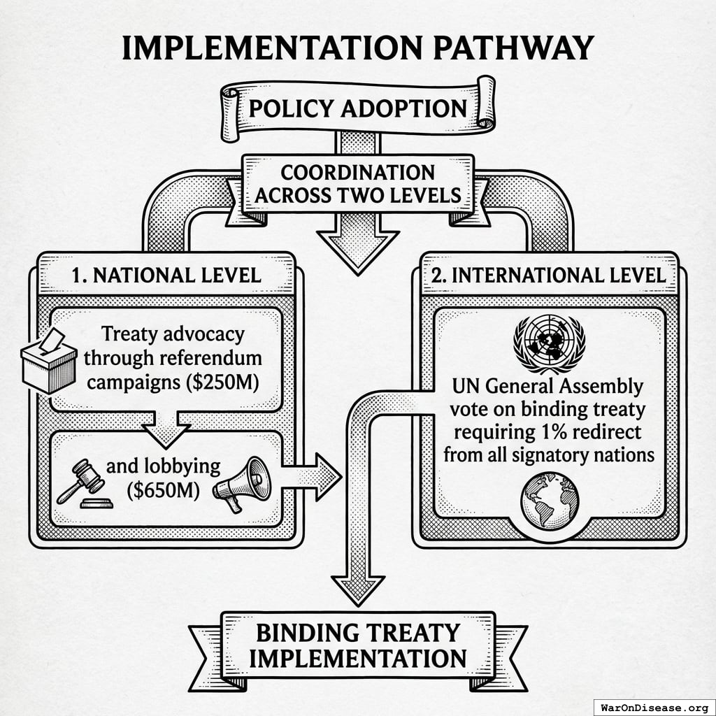 Treaty adoption depends on: 1. Political coalition: Build support among health ministries, fiscal conservatives seeking budget efficiency, and populations demanding better healthcare 2. Economic case: 637:1 (95% CI: 569:1-790:1) ROI makes this profitable, not charitable 3. Incentive Alignment Bonds: Fund $1B advocacy phase, align investor and political incentives 4. Diplomatic negotiation: UN General Assembly or coalition of willing nations