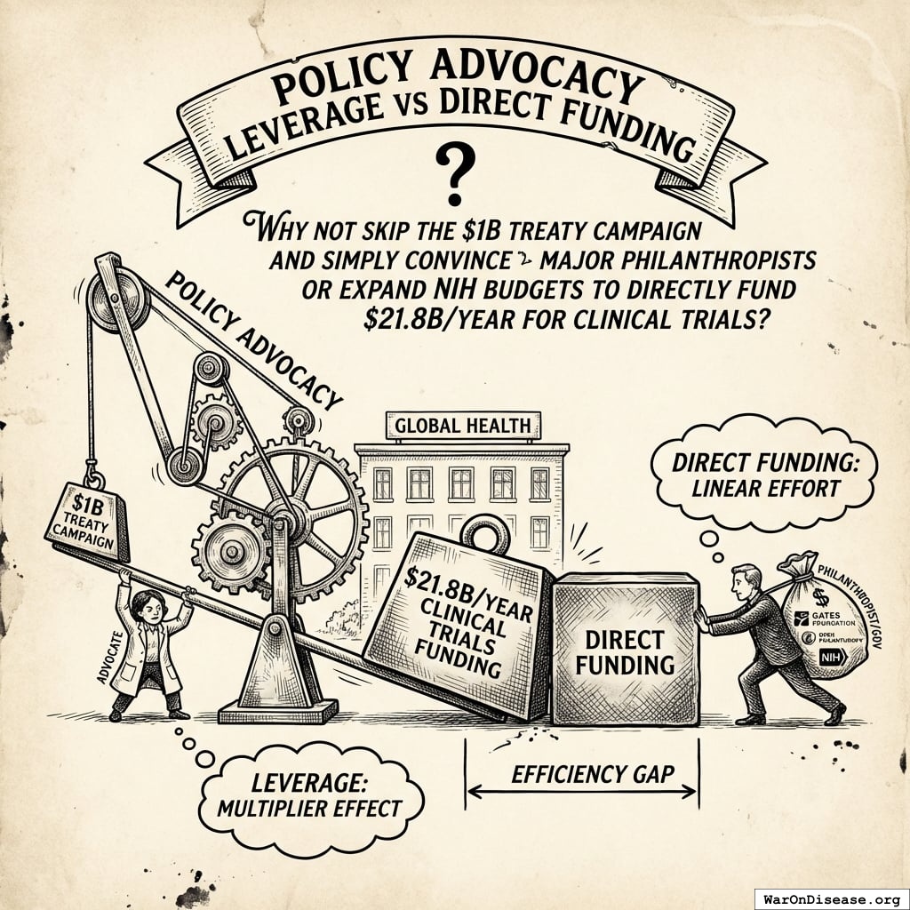 The Gates Foundation, USAID, and WHO should advocate for treaty adoption as their highest-leverage intervention: it multiplies the effectiveness of everything else they fund. The Gates Foundation’s historical pattern (spending billions on individual disease programs when the same capital could lobby for treaty passage and unlock $27.2B/year in government funding) exemplifies the “lottery tickets vs casino” problem described earlier. Advocacy for structural change offers superior ROI to direct program spending.