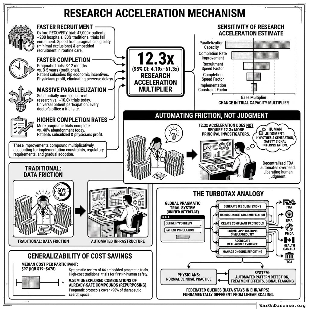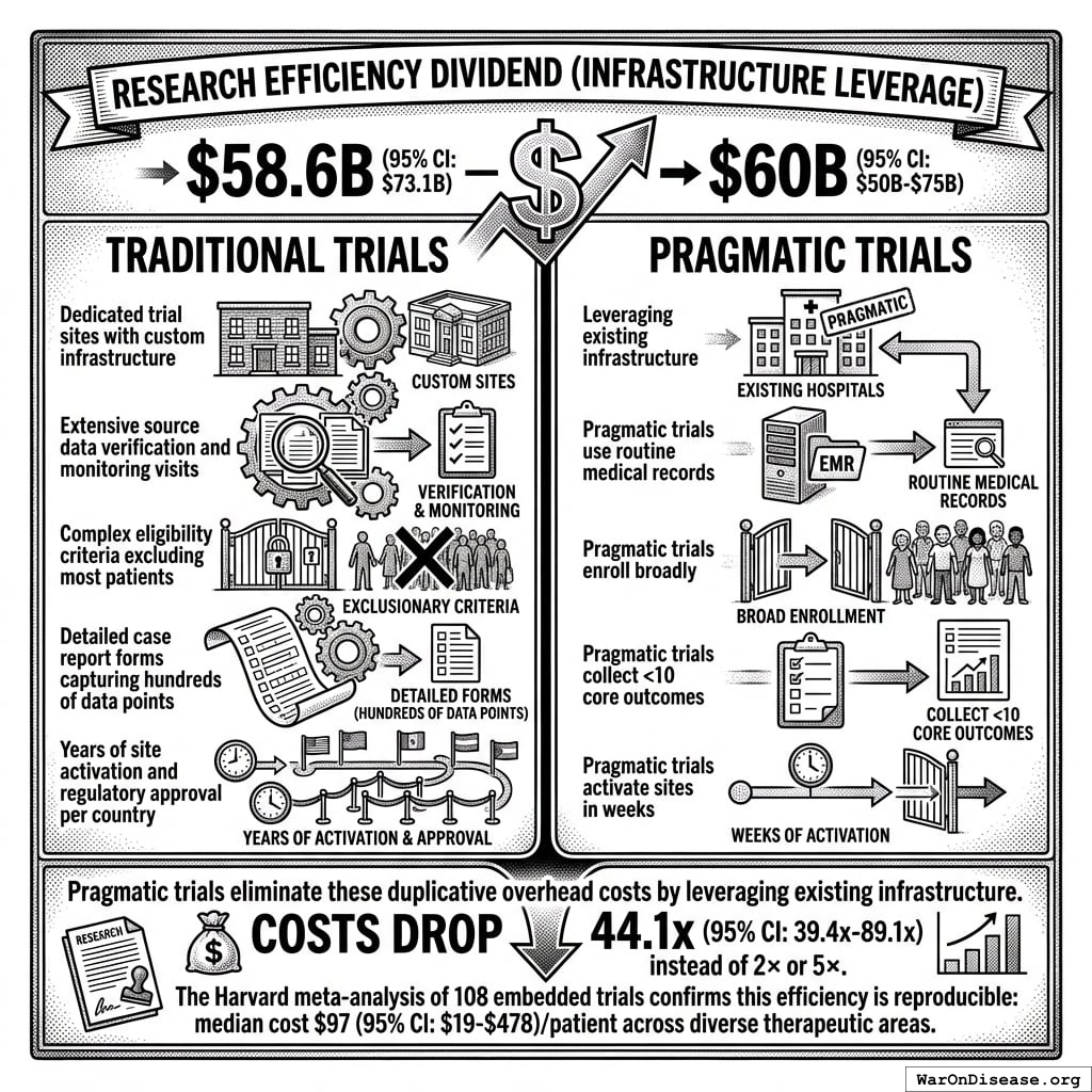 Multiple large-scale pragmatic trials and systematic reviews demonstrate that pragmatic trial design maintains scientific rigor while dramatically reducing costs. A Harvard meta-analysis of 108 embedded pragmatic trials found median costs of $97/patient138. The Oxford RECOVERY trial achieved $500 (95% CI: $400-$2.50K)/patient (under exceptional NHS/COVID conditions), while the PCORnet ADAPTABLE trial achieved $929 (95% CI: $929-$1.40K)/patient under normal conditions1. Our system projections use the conservative ADAPTABLE estimate ($929 (95% CI: $97-$3K)/patient). This 44.1x (95% CI: 39.4x-89.1x) cost reduction transforms the economics of medical research: what was previously too expensive to test becomes systematically explorable.