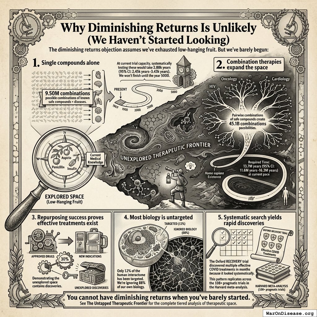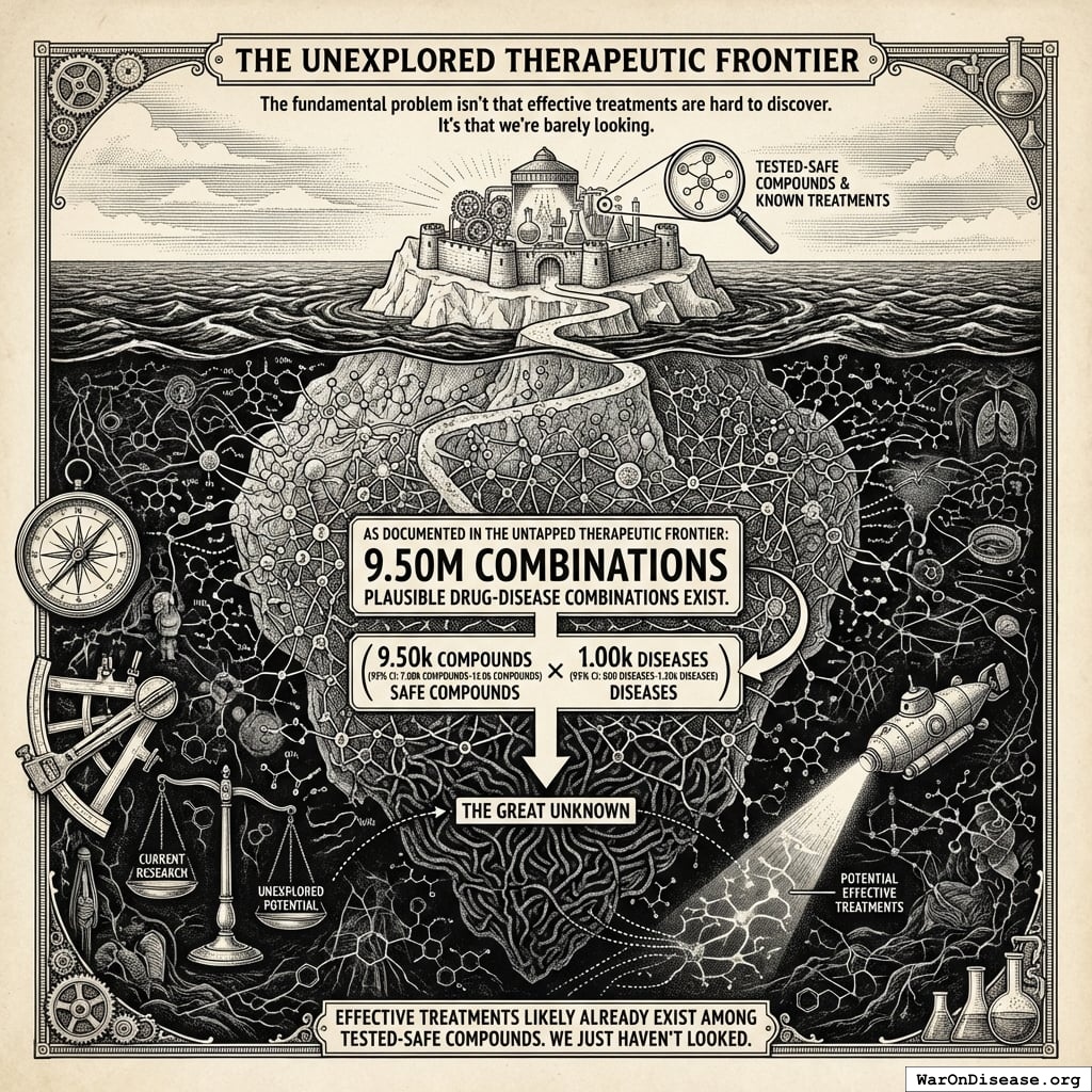 The bottleneck: Approximately 6.65k diseases (95% CI: 5.70k diseases-8.24k diseases) diseases lack effective treatments. At current trial capacity (~15 diseases/year (95% CI: 8 diseases/year-30 diseases/year) new treatments/year), systematically testing all 9.50M combinations plausible drug-disease combinations would take ~443 years (95% CI: 324 years-712 years). Effectively never.