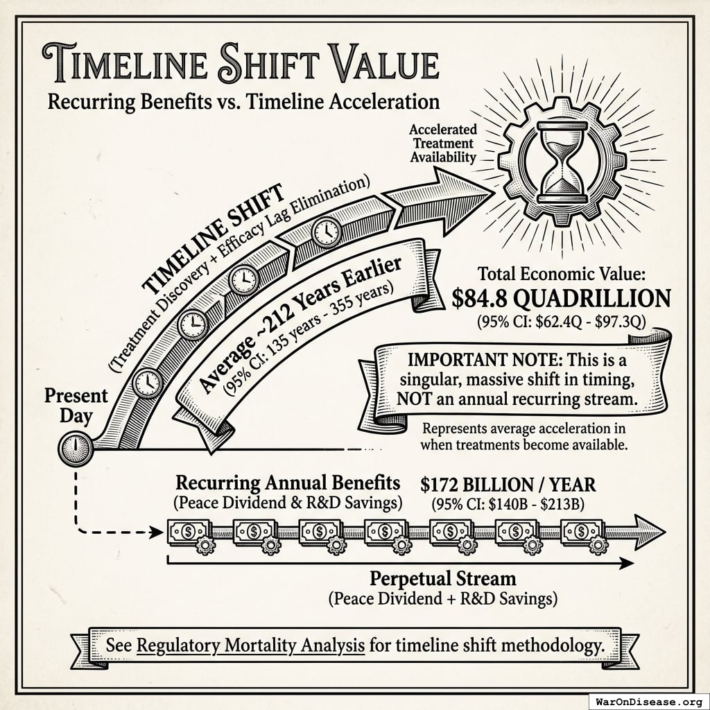 Important limitations: (1) Economic value estimates are cumulative over the ~212 years (95% CI: 135 years-355 years)-year timeline shift, not annual values. (2) All estimates are conditional on successful treaty implementation. (3) Phase I safety testing remains mandatory. What changes is eliminating post-safety efficacy delays. (4) The “quadrillion dollar” figures represent monetized value of lives saved over centuries of accelerated medical progress, using standard QALY methodology.