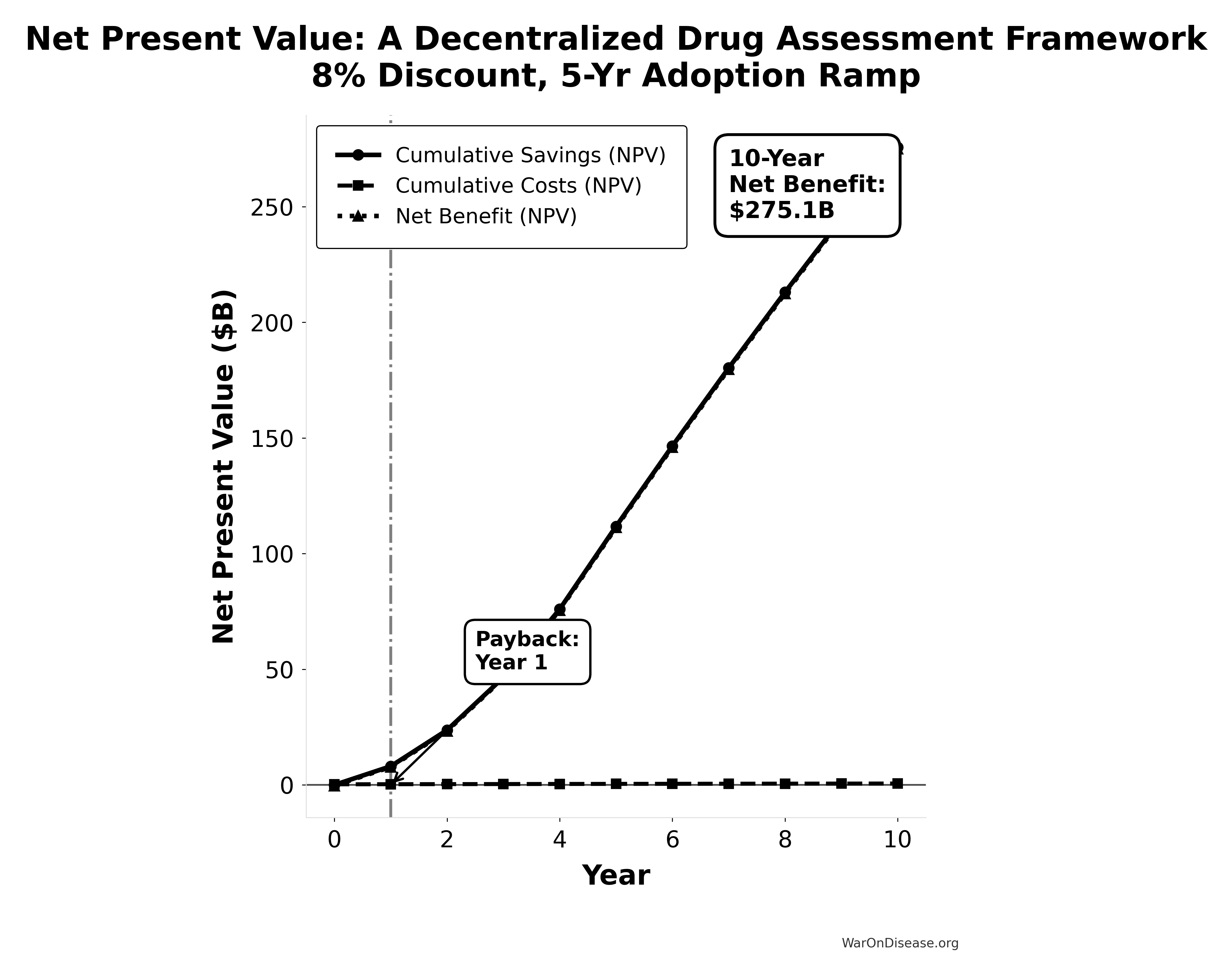Summary: An initiative to build a decentralized framework for drug assessment is projected to be a dominant healthcare transformation. The core technology platform itself is exceptionally efficient (annual operational costs ~$18.9M-$40M per the Costs for a Decentralized Framework - ROM Estimates (Partnership Model)), generating tens of billions in R&D savings. Even when considering broader total ecosystem costs (potentially $0.5B to $5B+ annually to include extensive global operations, participant compensation etc.), the initiative yields huge net monetary savings (e.g., $29.5B to $94.5B annually in various scenarios) while simultaneously preventing 7.94B DALYs through regulatory delay elimination. The combination of massive financial returns and significant health gains makes such a framework an exceptionally compelling investment.