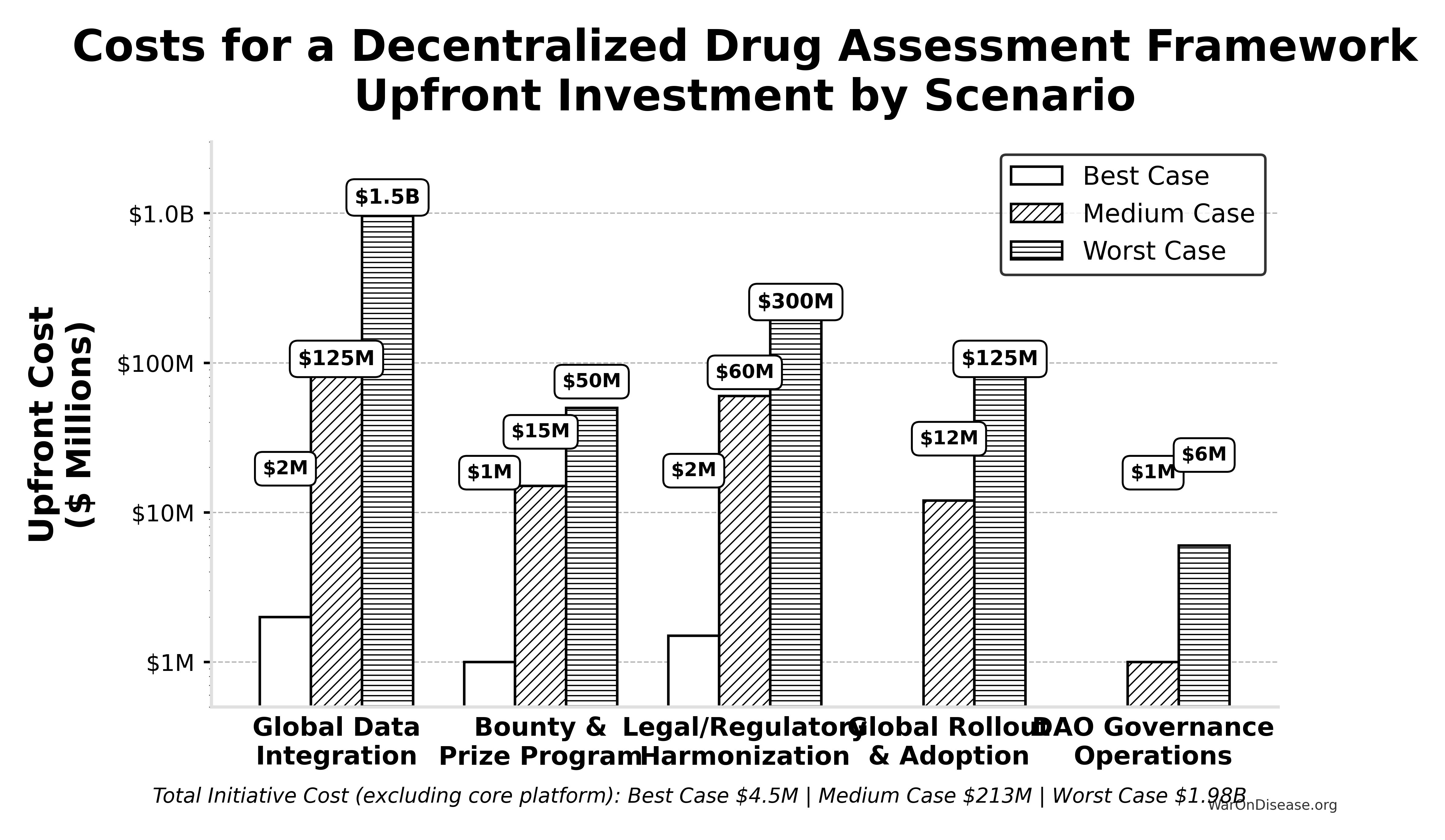 This top-down estimate matches the bottom-up analysis. While a core, open-source platform can start for tens of millions (upfront build ROM), a fully-realized, globally adopted decentralized framework for drug assessment represents a multi-hundred-million-dollar undertaking, consistent with “Medium Case” and “Worst Case” scenarios.