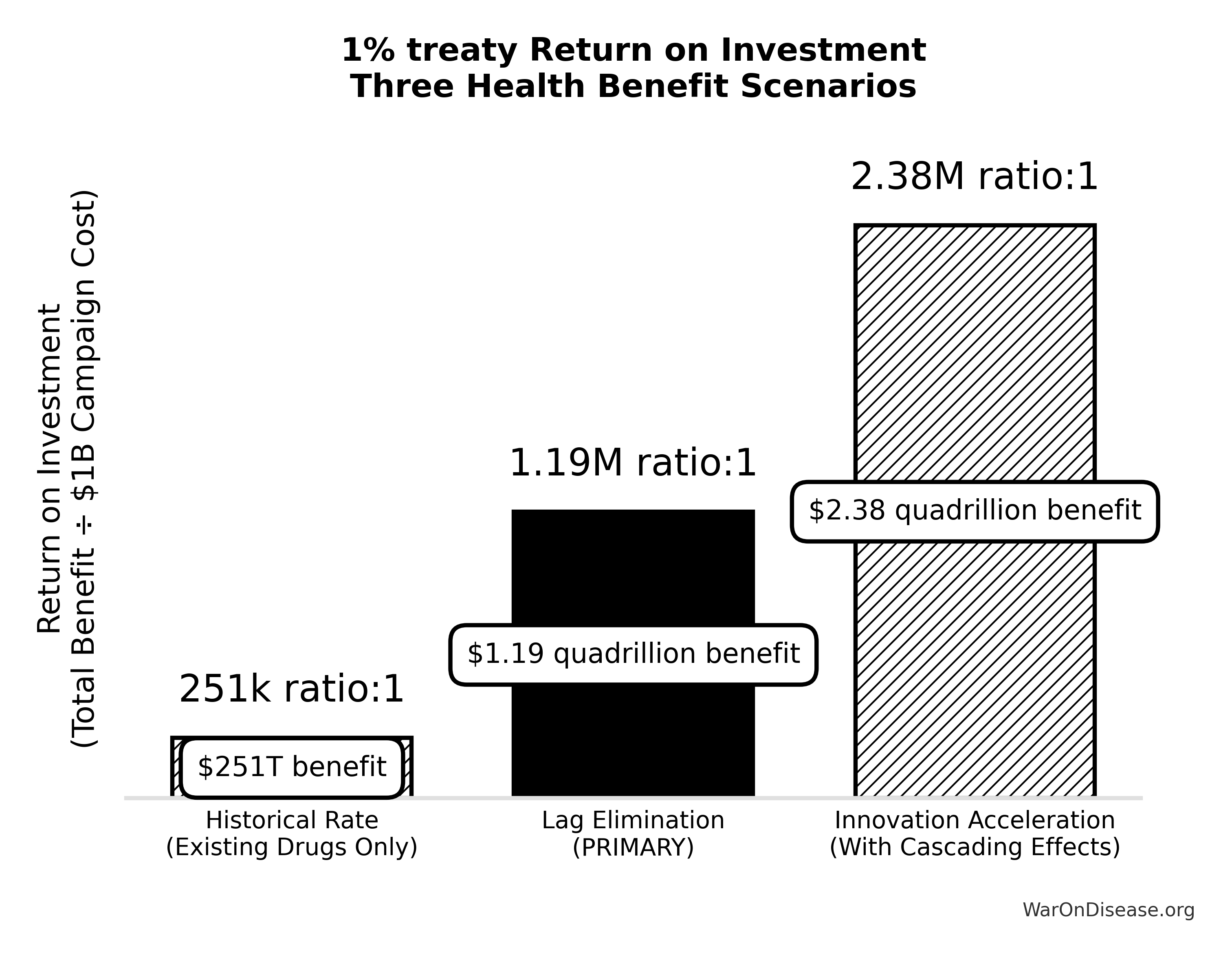 - 451 Return on Investment (R&D Only): A modest annual operational cost of ~$40M generates ~$41.5B in industry-wide savings, yielding an NPV of ~$249B over 10 years. Comprehensive ROI including all core benefits (R&D savings, regulatory delay elimination, and peace dividend): 1.19M (PRIMARY recommended estimate).