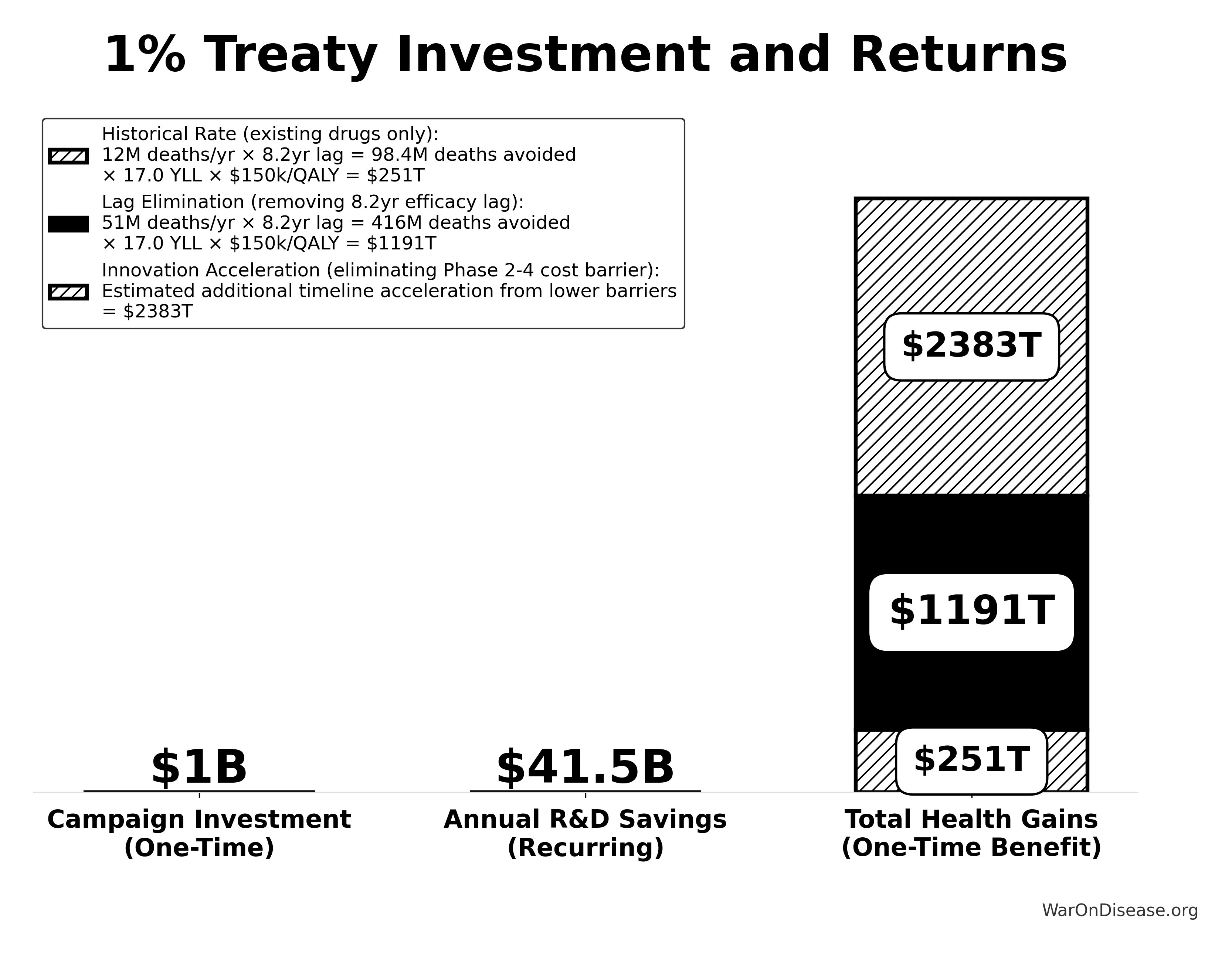 - Health Gains: 7.94B DALYs averted from eliminating post-safety efficacy lag (8.2-year timeline shift)