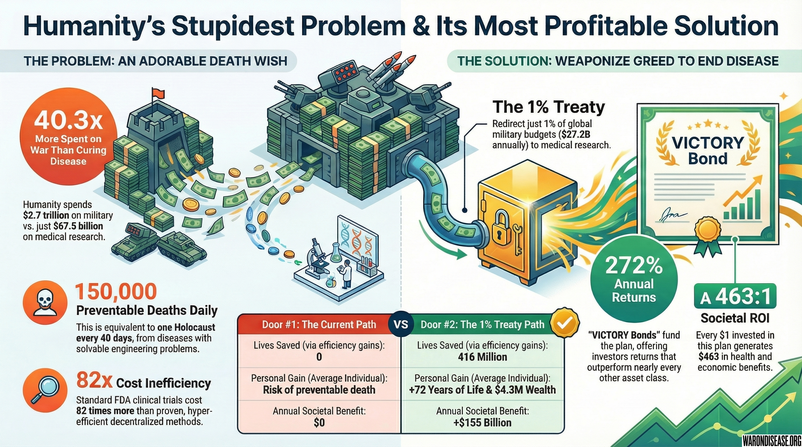 war-on-disease, 1-percent-treaty, medical-research, public-health, peace-dividend, decentralized-trials, dfda, dih, victory-bonds, health-economics, cost-benefit-analysis, clinical-trials, drug-development, regulatory-reform, military-spending, peace-economics, decentralized-governance, wishocracy, blockchain-governance, impact-investing