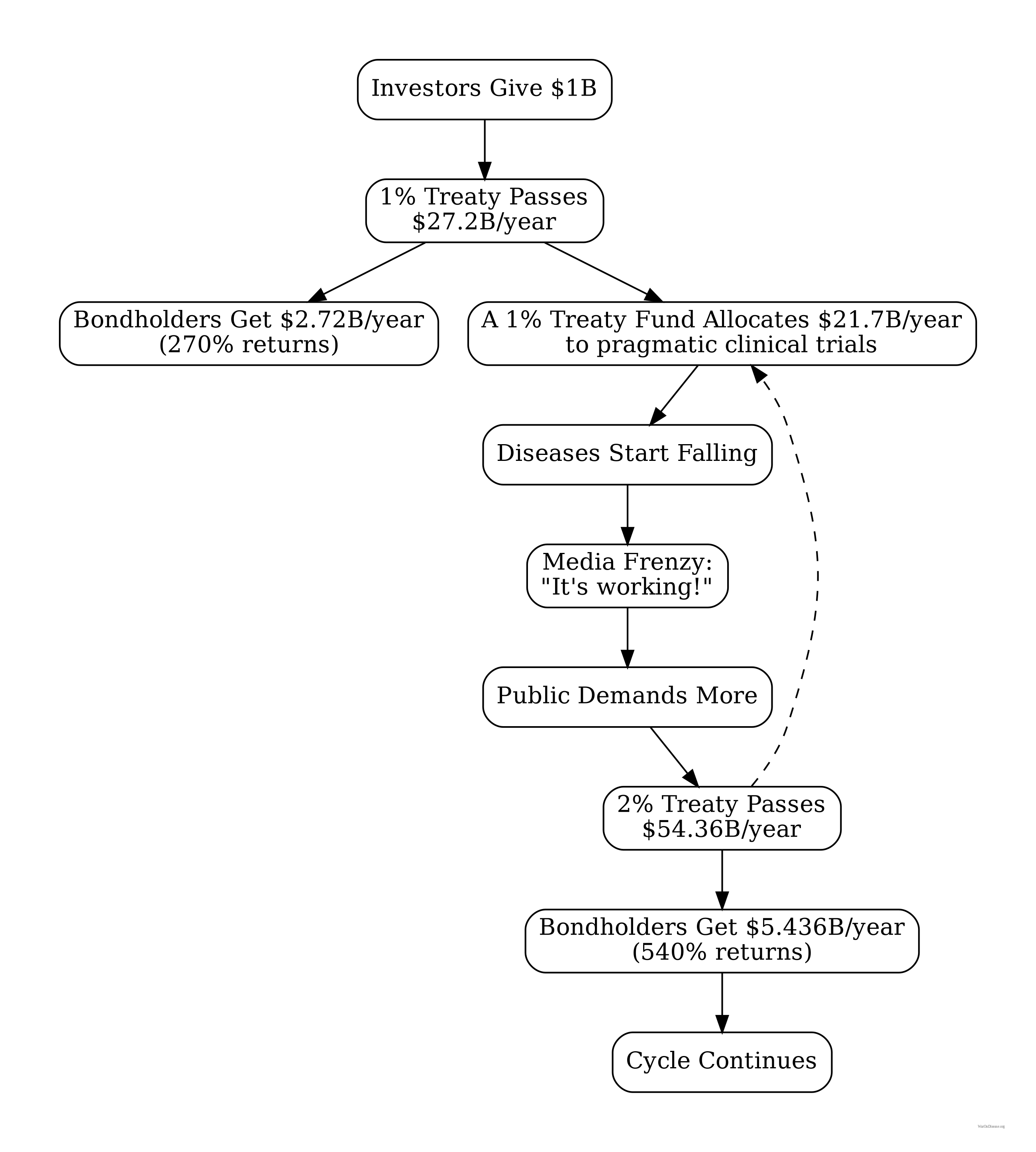 This is important: Investors aren’t “taking” money from sick people. 80% goes to cures. Bondholders get 10% for having the revolutionary idea of “what if we didn’t all die?” and another 10% keeps politicians incentivized to maintain and expand the treaty.