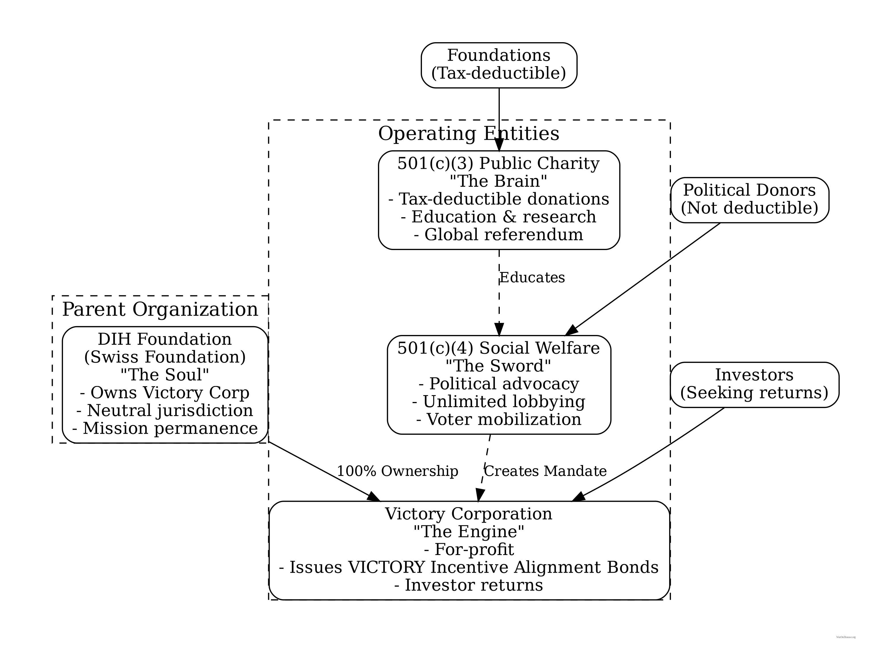 The Victory Corporation (for-profit) is the operational engine. Employs core team, raises capital, executes strategy.