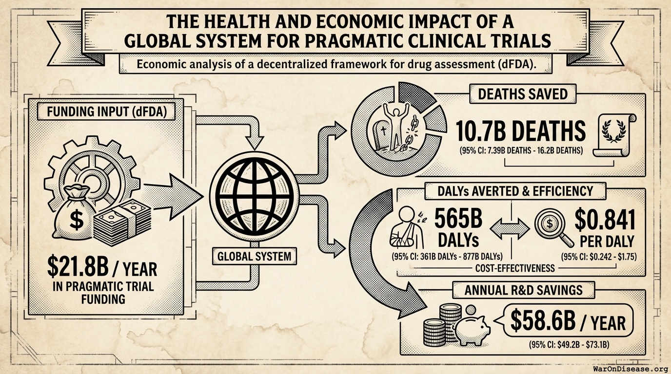 By allocating $21.8B/year to a decentralized FDA, automating efficacy testing through pragmatic clinical trials integrated into standard healthcare, this clears the 443 years (95% CI: 324 years-712 years) treatment testing backlog in 36 years (95% CI: 11.6 years-77.2 years), delivering 637:1 (95% CI: 569:1-790:1) ROI, saving 10.7B deaths (95% CI: 7.39B deaths-16.2B deaths), and generating $58.6B (95% CI: $49.2B-$73.1B) in annual R&D savings at $0.841 (95% CI: $0.242-$1.75)/DALY (97.7% (95% CI…