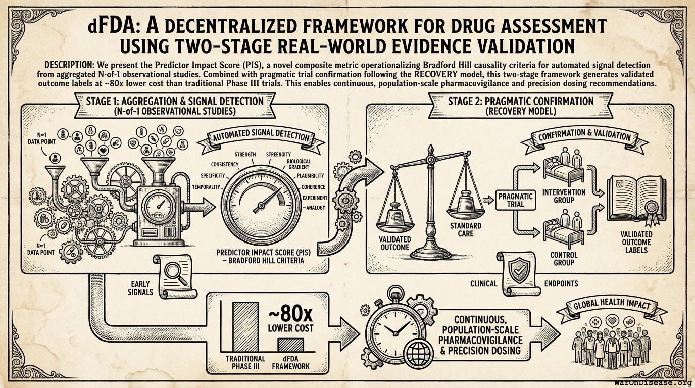 We present the Predictor Impact Score (PIS), a novel composite metric operationalizing Bradford Hill causality criteria for automated signal detection from aggregated N-of-1 observational studies. Combined with pragmatic trial confirmation (based on evidence from 108+ embedded trials), this two-stage framework generates validated outcome labels at ~44x lower cost than traditional Phase III trials. This enables continuous, population-scale pharmacovigilance and precision dosing recommendations.