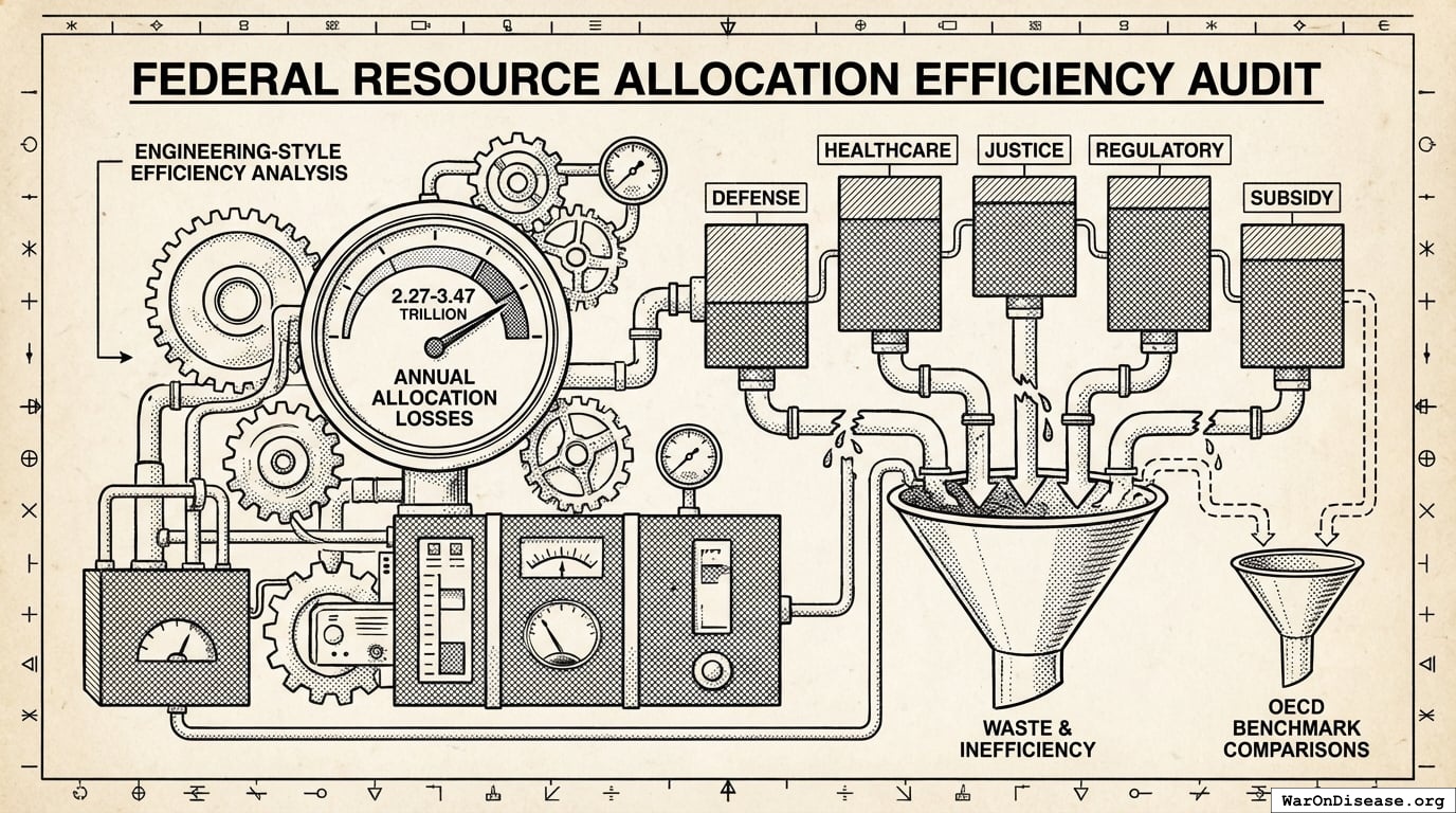 Engineering-style efficiency analysis quantifying $2.27-3.47 trillion in annual allocation losses across defense, healthcare, justice, regulatory, and subsidy subsystems, with OECD benchmark comparisons.