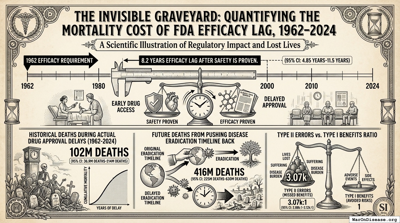 The 1962 efficacy requirement adds 8.2 years (95% CI: 4.85 years-11.5 years) to drug approval after safety is proven. This study quantifies two distinct mortality costs: (1) 102M deaths (95% CI: 36.9M deaths-214M deaths) historical deaths during actual drug approval delays (1962-2024), and (2) 416M deaths (95% CI: 225M deaths-630M deaths) future deaths from pushing the disease eradication timeline back. Type II errors exceed Type I benefits by 3.07k:1 (95% CI: 2.88k:1-3.12k:1).
