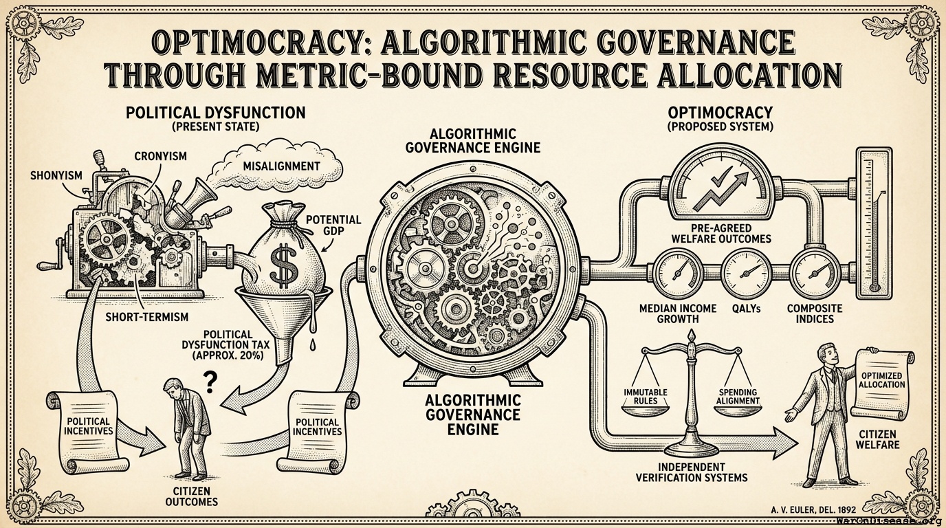 Political dysfunction (cronyism, short-termism, and misalignment between political incentives and citizen outcomes) costs society an estimated 20% of potential GDP (the “Political Dysfunction Tax”). Optimocracy proposes outcome-bound governance systems that optimize for Health & Wealth (median healthy life years + real after-tax median income growth), using evidence-based recommendations and independent verification to align both budget allocation and policy choices with citizen welfare.