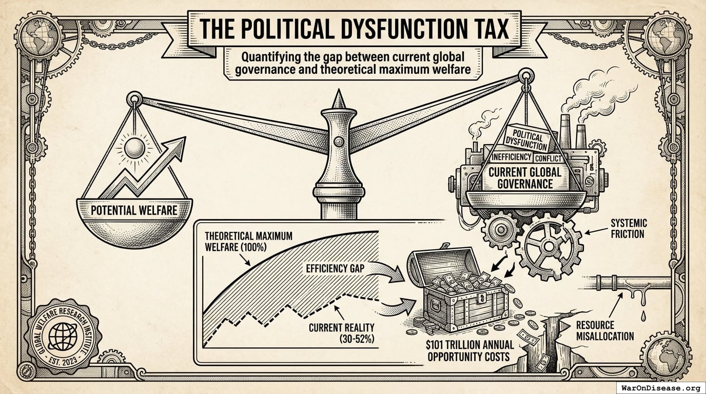 Quantifying the gap between current global governance and theoretical maximum welfare, estimating a 30-52% efficiency score and $101 trillion in annual opportunity costs.