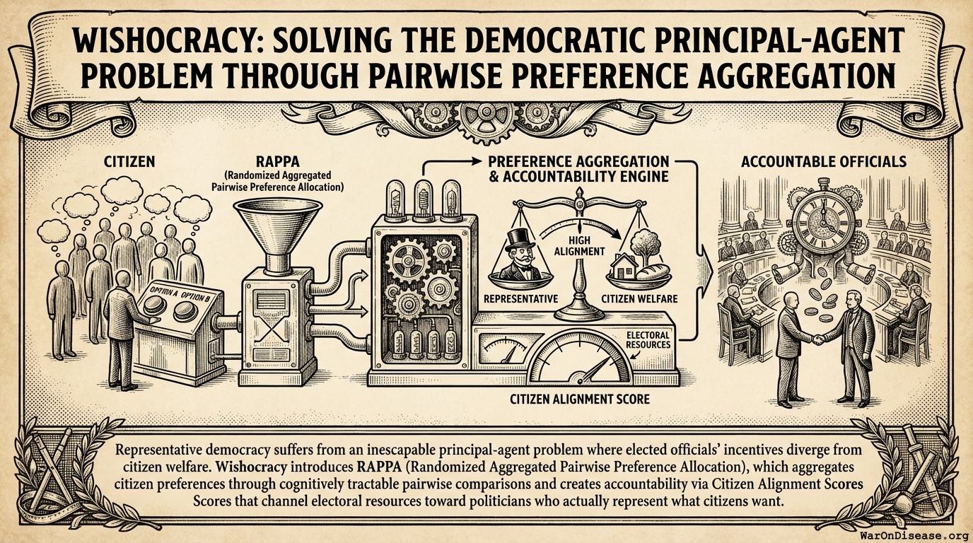 Representative democracy suffers from an inescapable principal-agent problem where elected officials’ incentives diverge from citizen welfare. Wishocracy introduces RAPPA (Randomized Aggregated Pairwise Preference Allocation), which aggregates citizen preferences through cognitively tractable pairwise comparisons and creates accountability via Citizen Alignment Scores that channel electoral resources toward politicians who actually represent what citizens want.