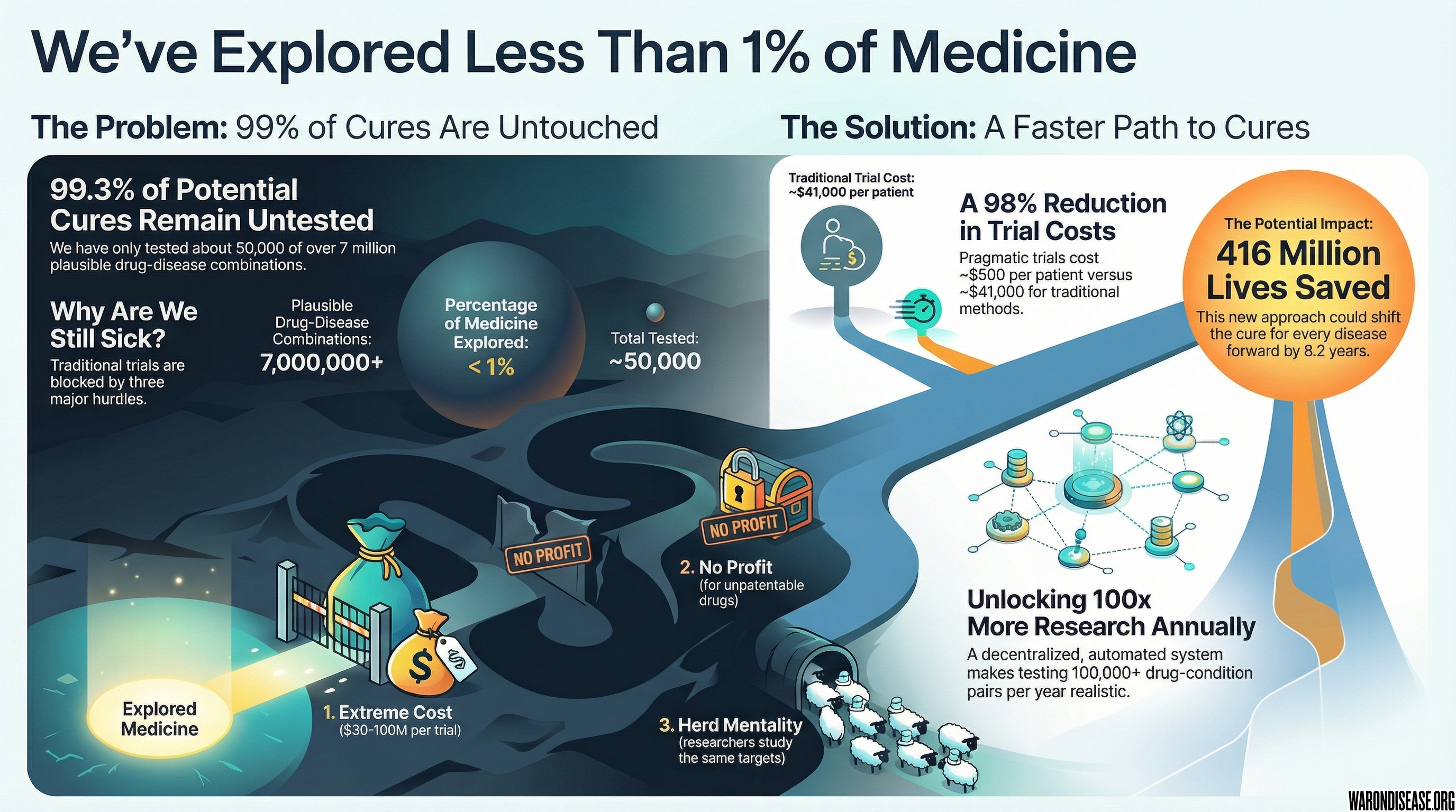 The overwhelming majority of therapeutic potential remains untouched. Not because cures are impossible. Because trials are too expensive and too slow.